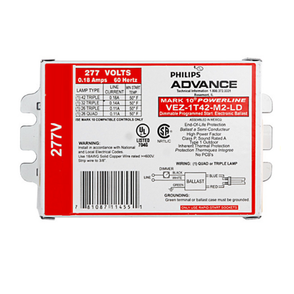 The Advance VEZ-1T42-M2-LD is a Mark 10 Powerline electronic dimming ballast designed for (1) compact fluorescent lamp (CFL) with G24Q or GX24Q bases. It operates on 277V (120-277V capable) with programmed start technology, providing reliable ignition and extended lamp life. The ballast features phase-cut dimming from 100% down to 3% light output when used with a compatible Mark 10 Powerline dimmer.